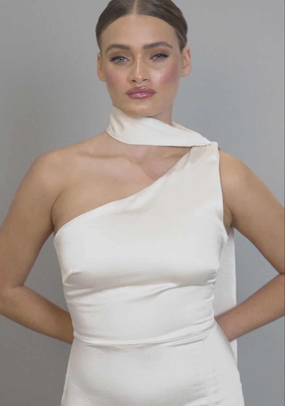 Polished minimalism meets red-carpet fluidity in the Cordula Maxi Dress in soft cream satin. Designed with an asymmetric neckline and coordinating satin scarf detail, this piece redefines occasionwear with clean, directional lines. The body-skimming silhouette flows into a side split, offering both movement and allure with every step.