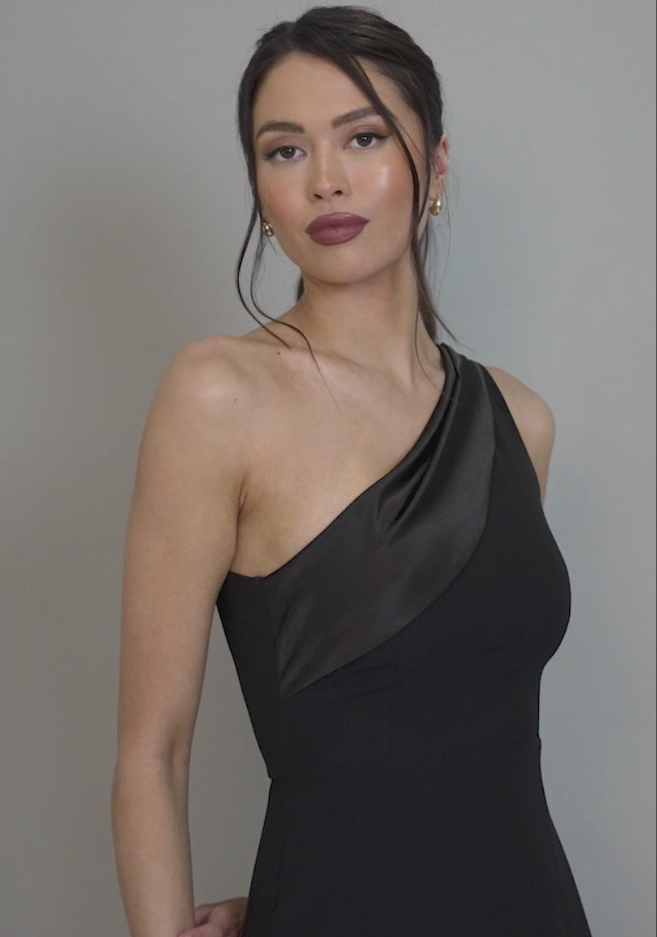 Sleek and statuesque, the Fliss One-Shoulder Maxi Dress in Black delivers refined drama with a contemporary twist. Cut from our premium crepe fabric, the floor-length silhouette skims the figure with a smooth, fluid drape, while a high side split introduces understated movement. The asymmetric neckline is elevated by a sweeping satin panel, creating a striking contrast in texture and structure - a modern detail that catches the light with every step.