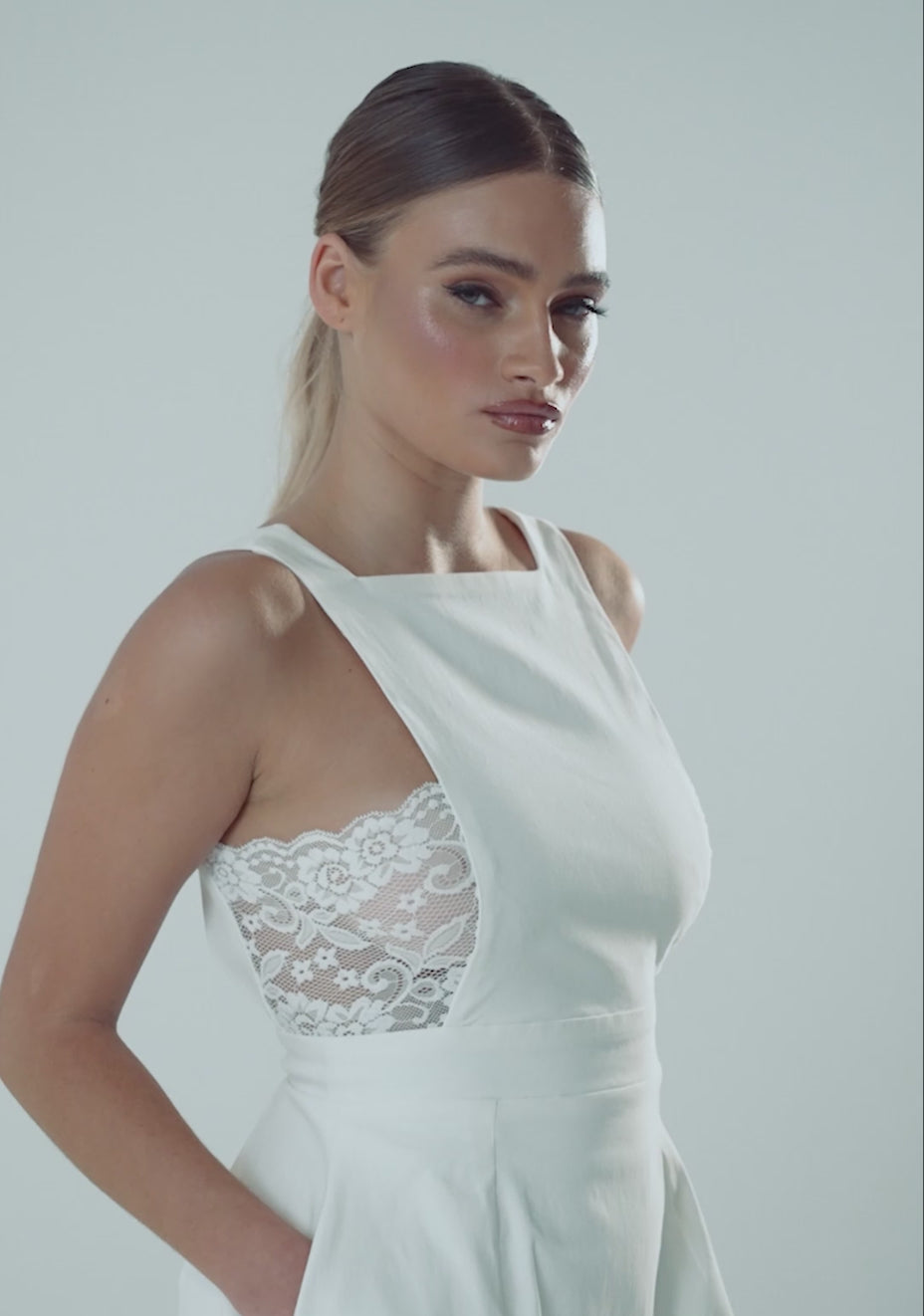 Refined and effortlessly modern, the Noa Open Back Mini Dress in ivory redefines minimalist occasion wear. Designed with a sculpted, bodycon underlay mini skirt and a softly flared A-line overlay, this silhouette plays with contrast - offering sharp structure with light, fluid movement. A clean squared neckline and wide straps frame the décolletage, while the daring open-back detail adds an elegant, unexpected twist.
